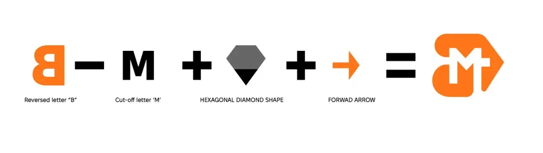 The final identity centers on a custom mark that fuses meaning with simplicity. The design combines a reversed “B” and a cut-off “M,” whose right edge extends into the descending line of a diamond shape. At its sharp point, the form transforms into a forward-moving arrow, symbolizing precision, clarity, and progress.